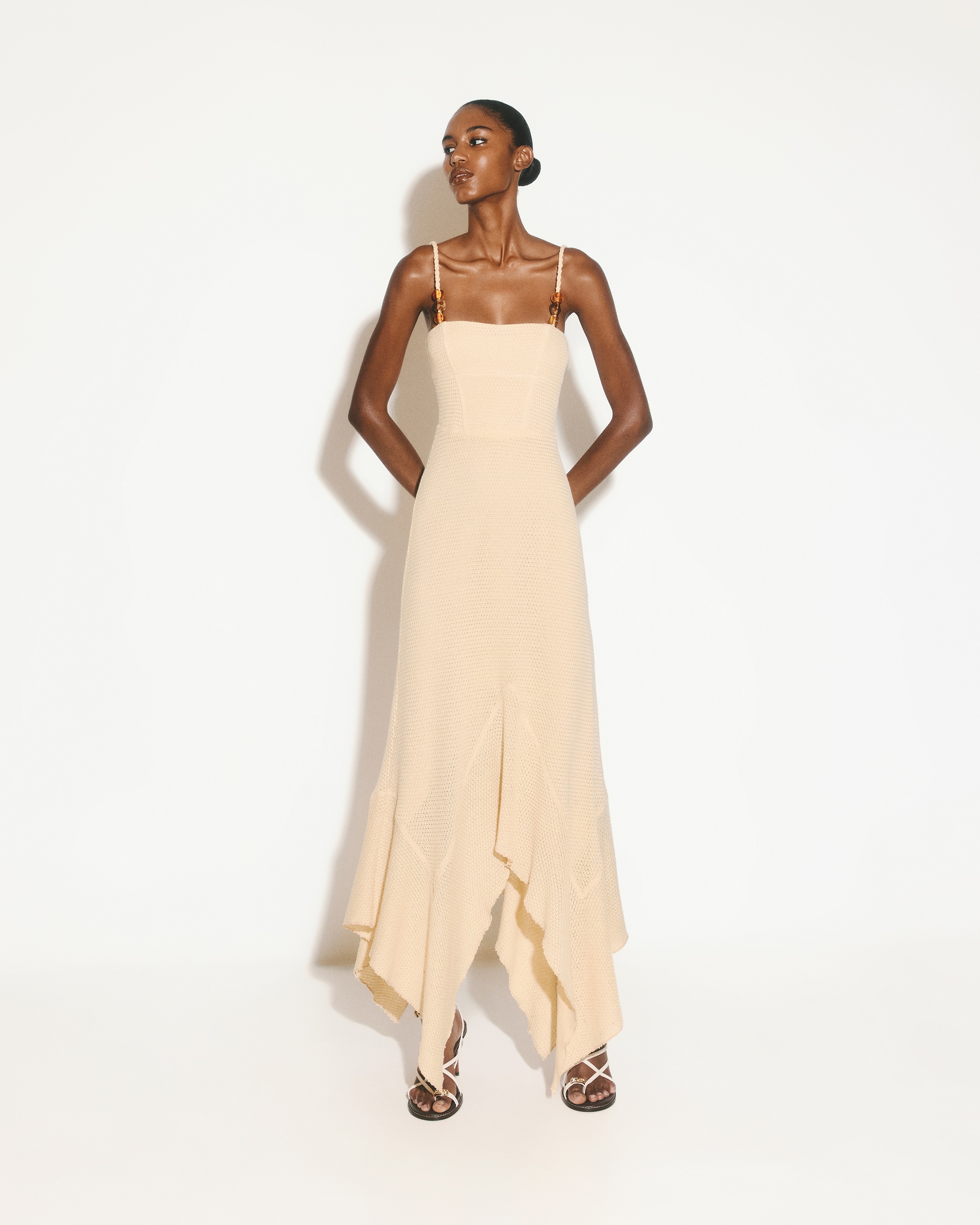 Vestido de renda crochet com detalhe na alça ponteira e fechamento em zíper.