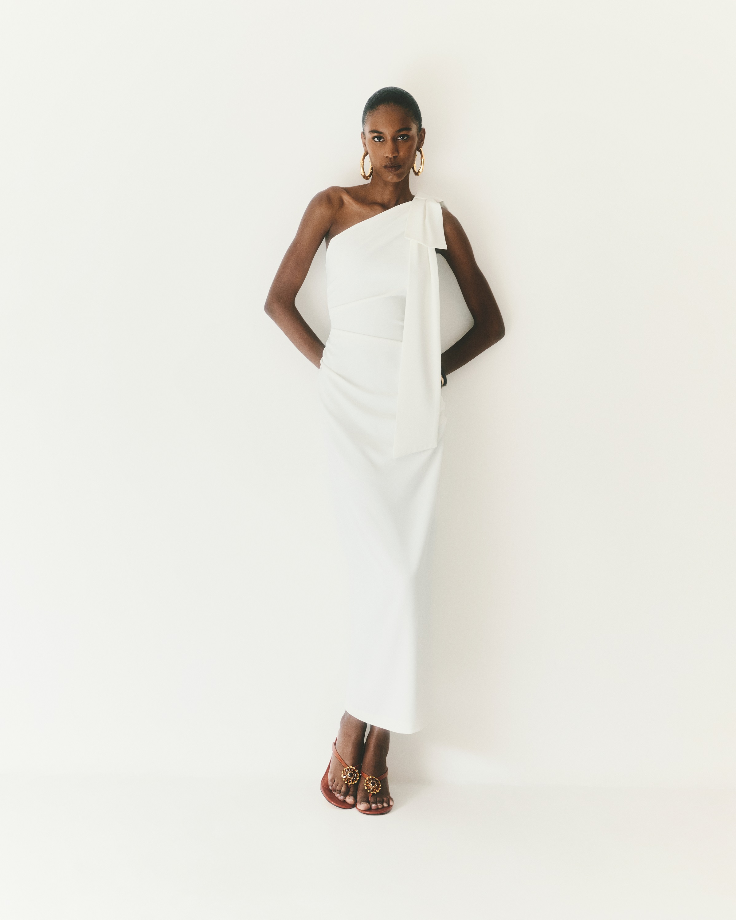 Vestido de um ombro com laço e zíper nas costas.